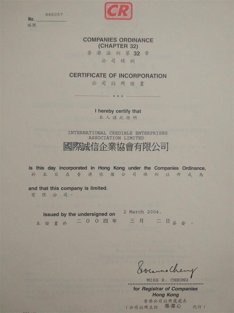 (后更名为世界信用组织有限公司、公司证书无须每年换发):编号:886057